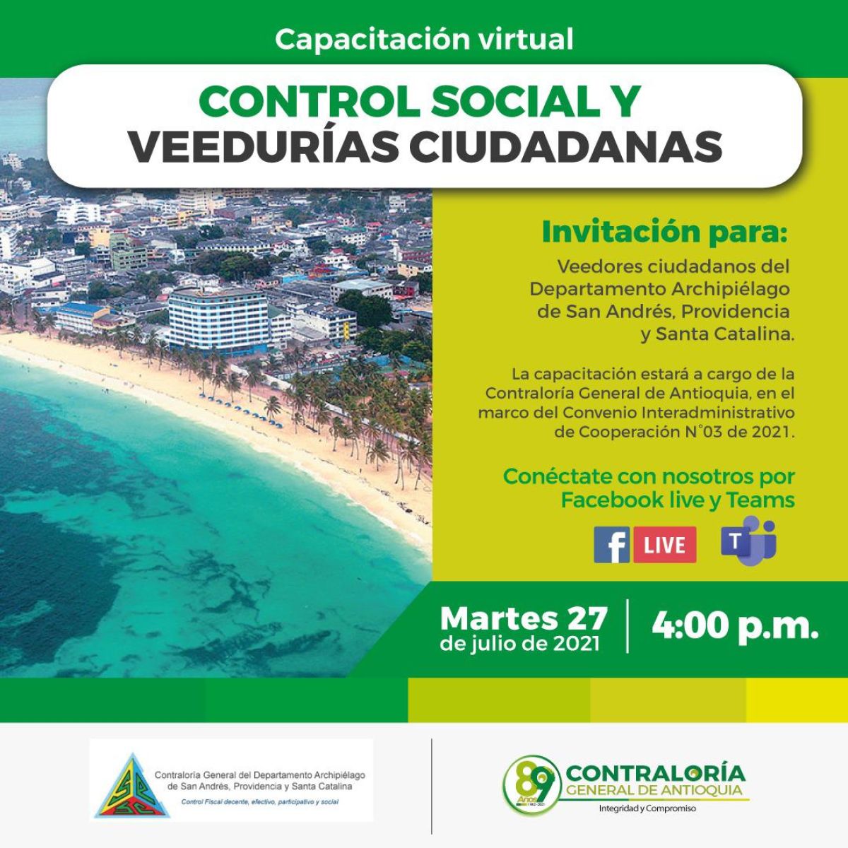 San Andrés Islas 19 de julio de 2021: Con el propósito de continuar fortaleciendo los procesos de participación ciudadana en las islas y las acciones y gestiones que realizan las veedurías ciudadanas para cuidar los recursos públicos, la Contraloría Departamental de San Andrés, Providencia y Santa Catalina, con el apoyo de la Contraloría General de Antioquia, realizan este martes 27 de julio, la capacitación ́Veedurías Ciudadanas para el Ejercicio del Control Social’